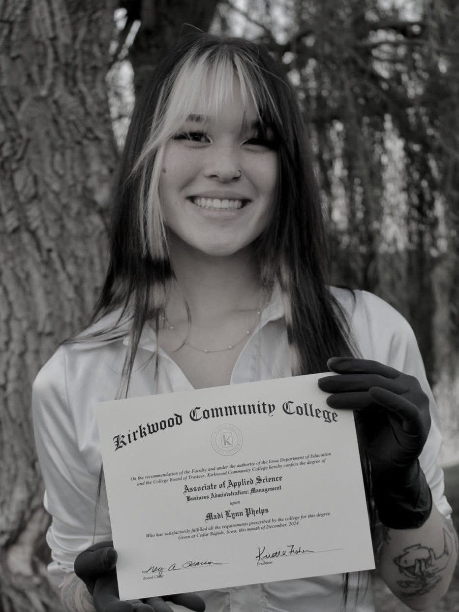 Zing graduated from Kirkwood in 2024 with an Associate in Business Administration Management. She's been a licensed tattoo artist since 2023, and started when she was 19. She enjoys fine-line, realism, traditional, neo trad, you name it. More specifically, if it's Asian inspired or video game related, she's in! Zing is also a muralist. From private residential walls, to large commercial work, she'd be more than happy to add some color in your home or business.